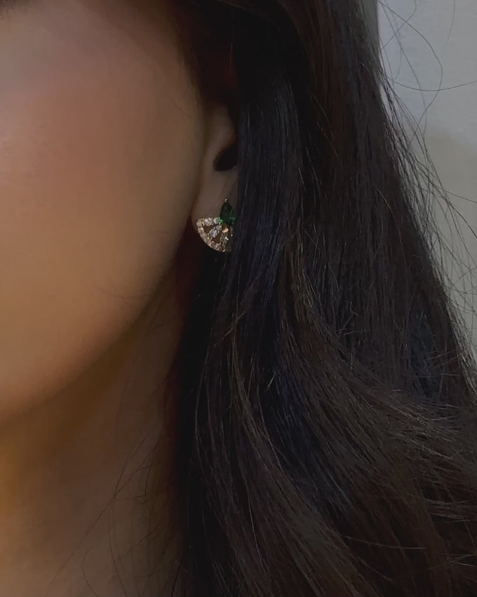 A luminous crescent silhouette brought to life with rich emerald sparkle. The Nourah – Emerald Studs are designed to reflect soft radiance with every movement, blending refined brilliance with a sculpted, modern form.